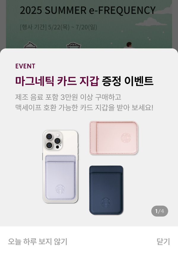 25년 6월 26일부터 스타벅스에서 제조 음료 포함 3만 원 이상 구매 시, 맥세이프 카드지갑을 사은품으로 증정하고 있습니다.